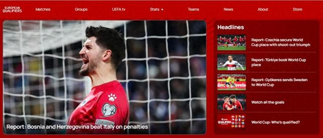 欧足联官网对4场附加赛决赛的报道截图。瑞典队与波兰队上演进球大战,波兰队下半场第55分钟的进球一度让两队战成2比2。关键时刻,在英超阿森纳队效力的前锋哲凯赖什展现球星风采,在第88分钟打入“绝杀”,北欧劲旅淘汰波兰队晋级。